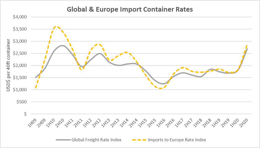 [i] Notes: Drewry's container freight rate benchmarks for multiple trade routes and port pairs are based on averages of representative rates paid by freight forwarders to ocean carriers. The rate benchmarks represent spot market rates for Full Container Loads (FCL) paid by freight forwarders to ocean carriers for a particular month or week. They are affected by seasonal and short-term supply-demand factors, notably by the peak season in the trades from Asia. The monthly/bimonthly rate benchmarks are All In (i.e. all inclusive) and include the base ocean rate, the Terminal Handling Charge (THC) both at origin and at destination, the fuel surcharge (BAF) and all other surcharges levied by ocean carriers. They do not include documentation charges or inland transport costs (except for rates to US inland ramps). The rate benchmarks are for standard dry freight containers.